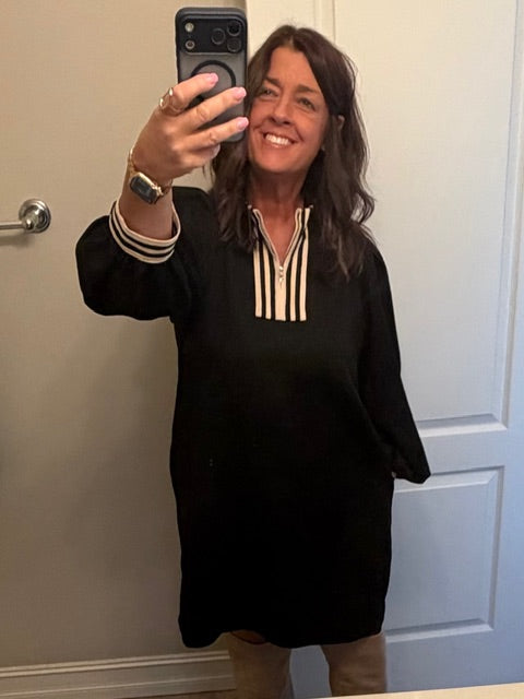Stripe Contrast Detail Zip Up Casual Dress-Black